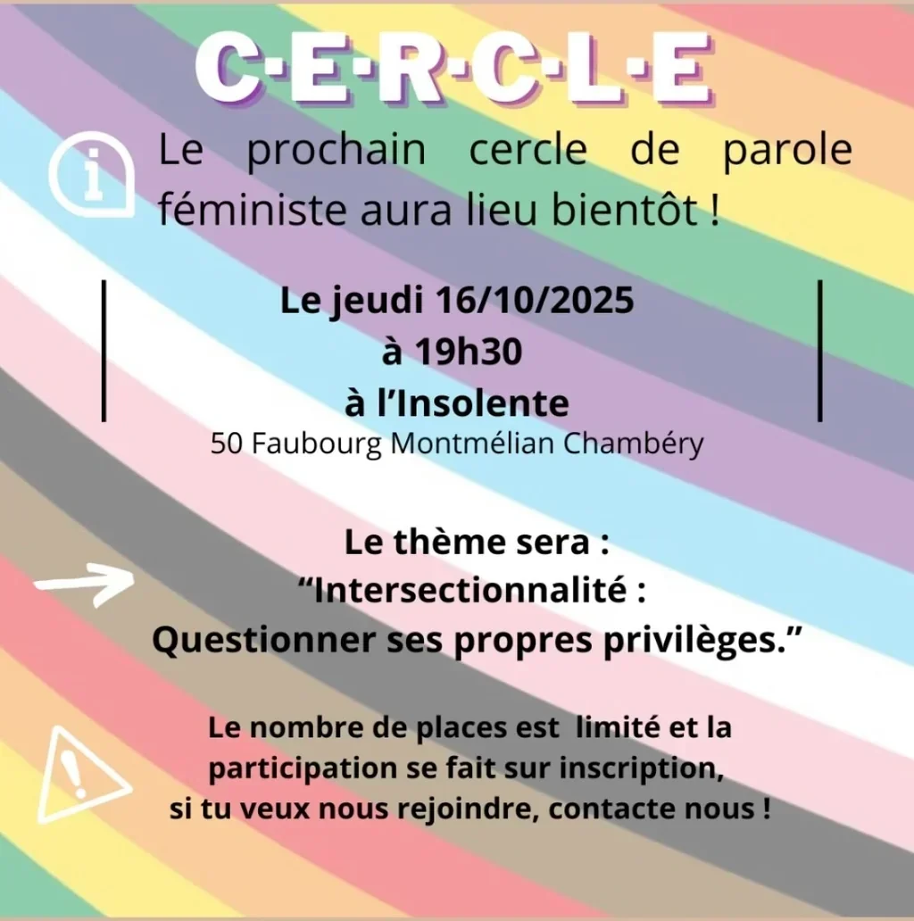 Le prochain cercle de parole féministe sera un cercle à thème ! Il aura lieu en mixité choisie entre femmes et personnes non-binaires le jeudi 16 octobre 2025 à 19h30 à l'insolente :)