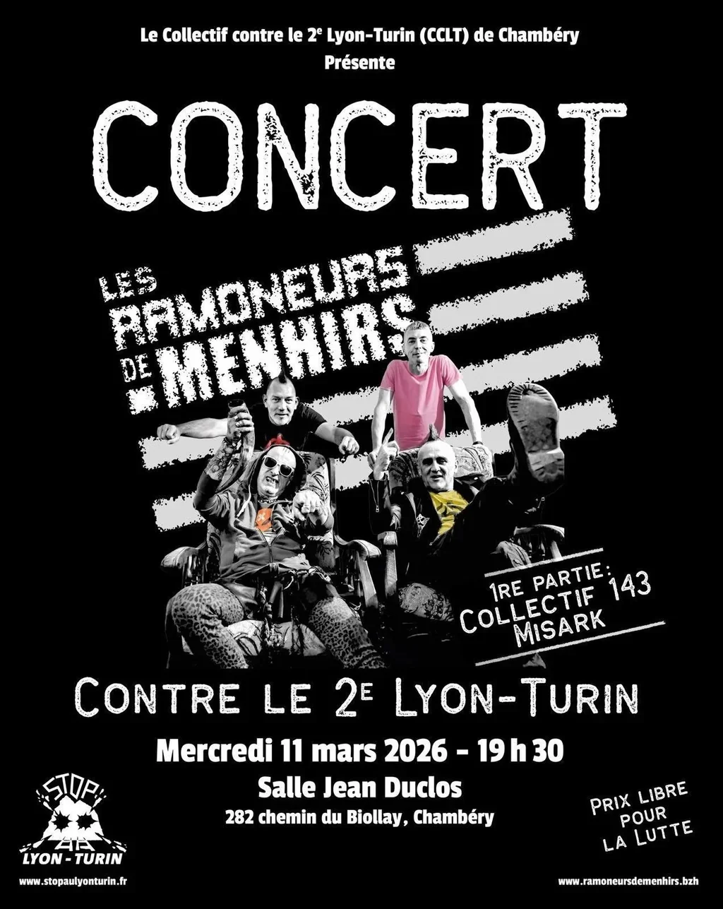 La veille de leur concert à la Soute, les Ramoneurs viennent donner un concert de soutien au Collectif Contre le Lyon Turin à la Salle Jean Duclos au Biollay 🔥