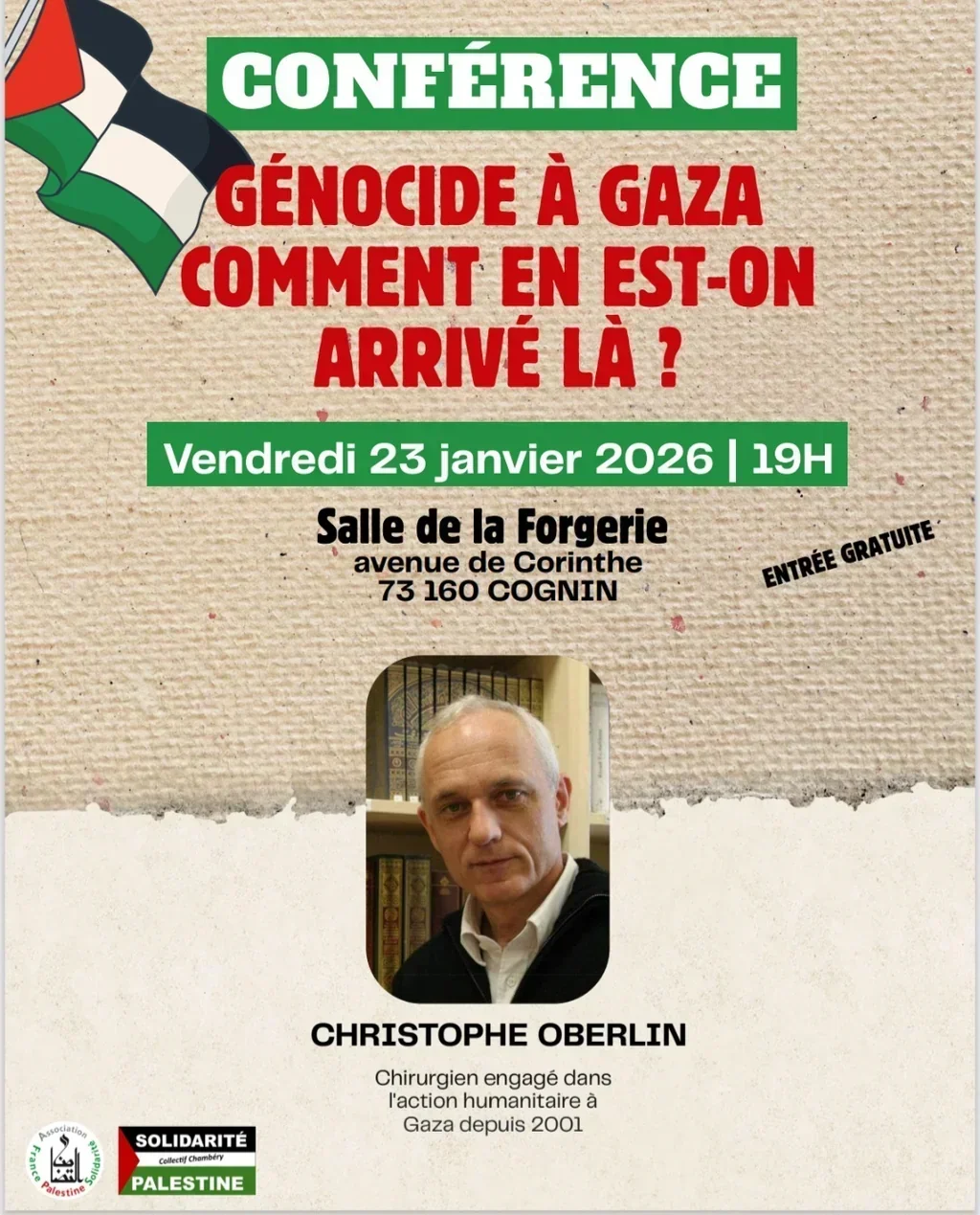 L'association France Palestine Solidarité et La Collectif Solidarité Palestine Chambéry vous invitent le vendredi 23 janvier 2026 à 19h.