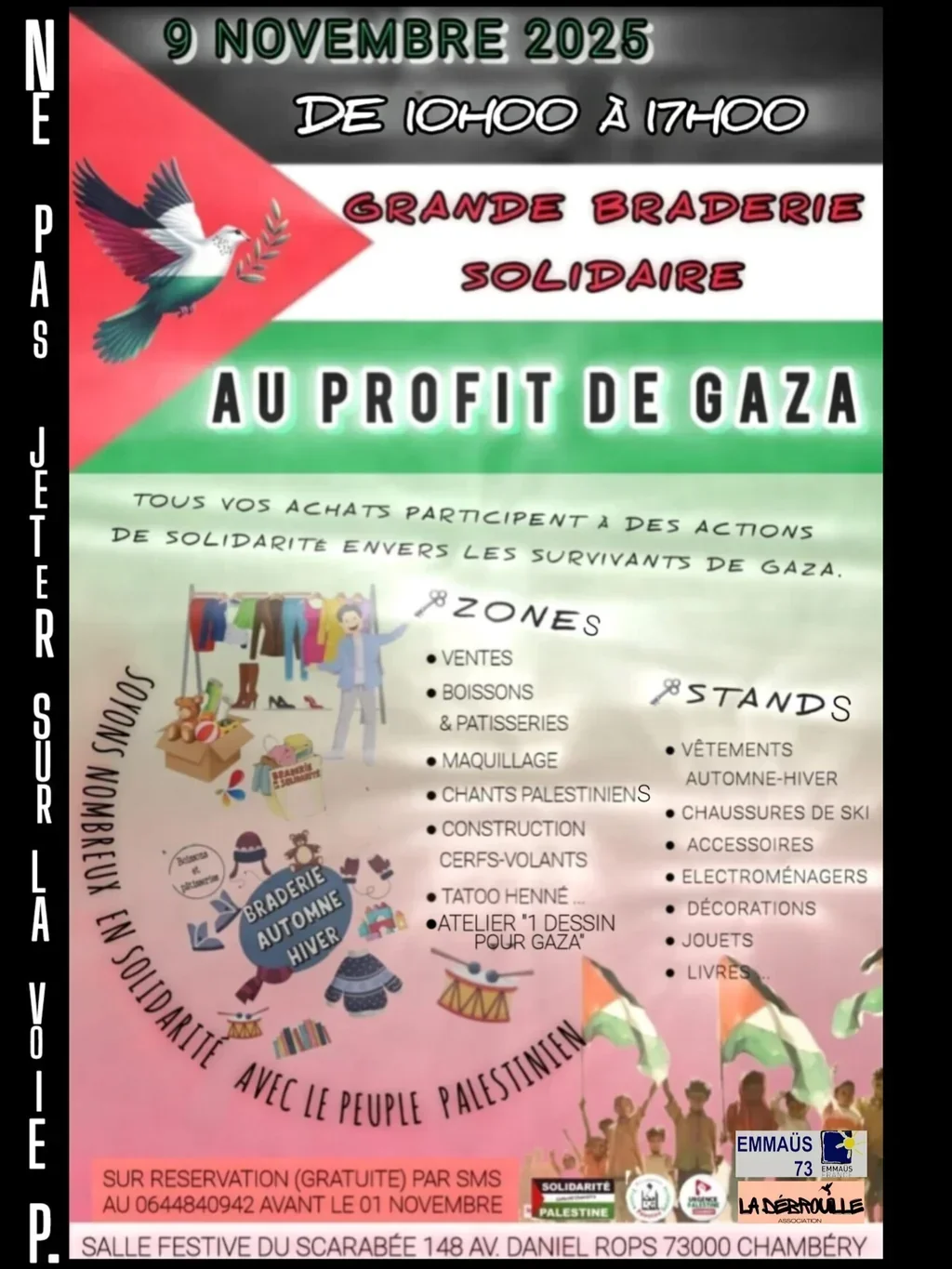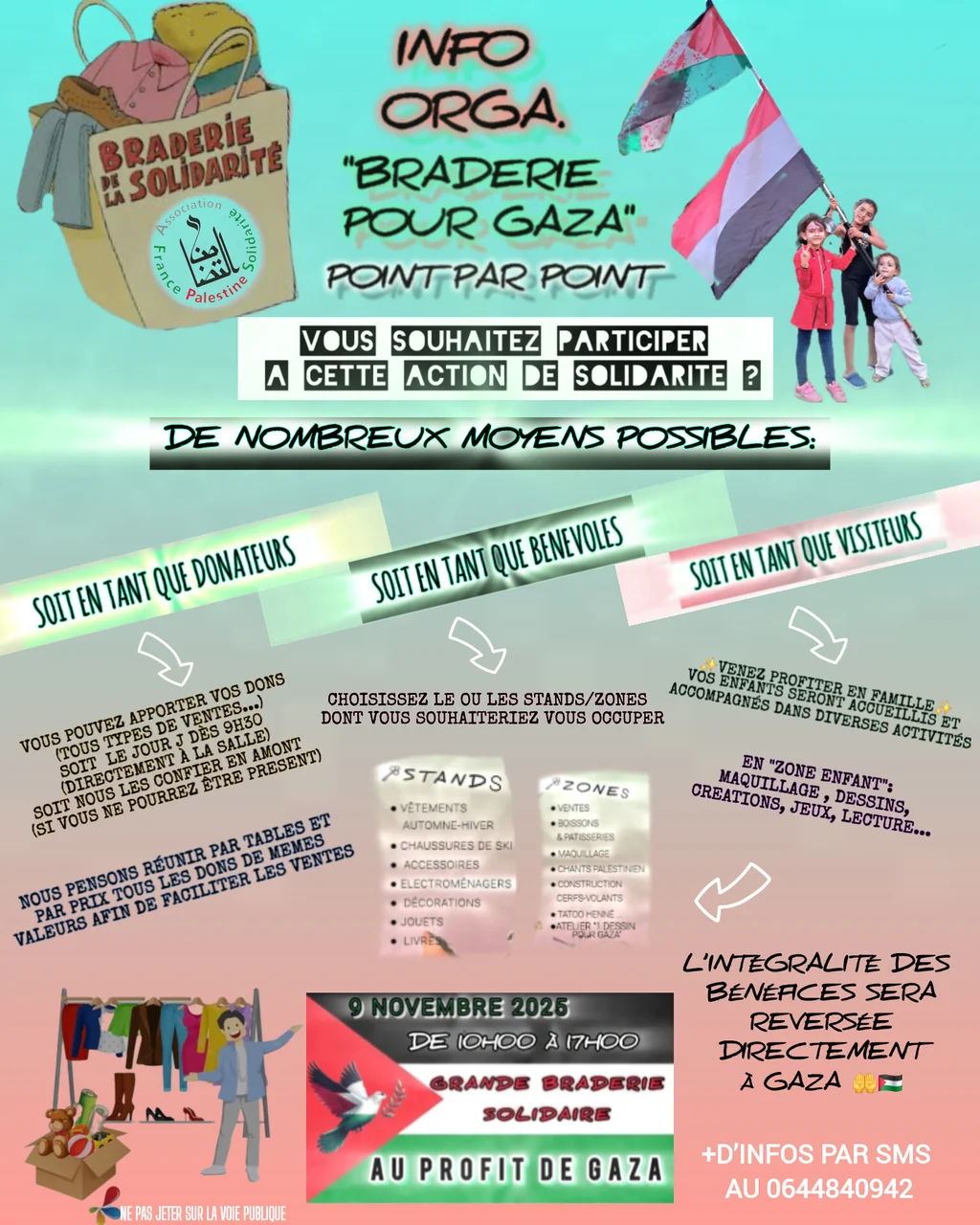 Une braderie solidaire au profit de Gaza se tiendra le dimanche 9 novembre avec diverses animations : des stands (vêtements, jouets, livres etc), vente de boissons, patisseries, crèpes, maquillage, henné, construction de cerfs-volants, dessins etc Tout sera vendu au profit de Gaza.