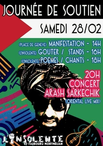 Manifestation place de Genève à 14h puis goûter/stands à 16h à L'Insolente, suivi d'un moment poèmes/chants à 18h. Enfin à 20h, concert d'Arash Sarkechik (musique orientale live mix).