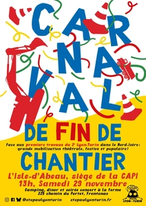 Pour exiger la fin de ces chantiers naissants, venez nombreux et nombreuses à cette grande fête de fin de chantier. Avec vos gilets oranges et casques de chantier, venez participer à une fausse inauguration de ces travaux, puis à leur mise à l’arrêt dans cette grande manifestation théâtrale, festive et participative !