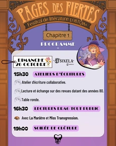 Nous vous avons concocté un programme sur deux jours, les samedi 25 et dimanche 26 octobre, mêlant rencontres, dédicaces, prises de parole, lectures drags (pour enfants et tout public) ainsi que plusieurs ateliers participatifs.