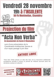 Ce vendredi 28 novembre à 19h à l’Insolente (50 faubourg Montmélian à Chambéry) aura lieu la projection d’"Acta Non Verba" -