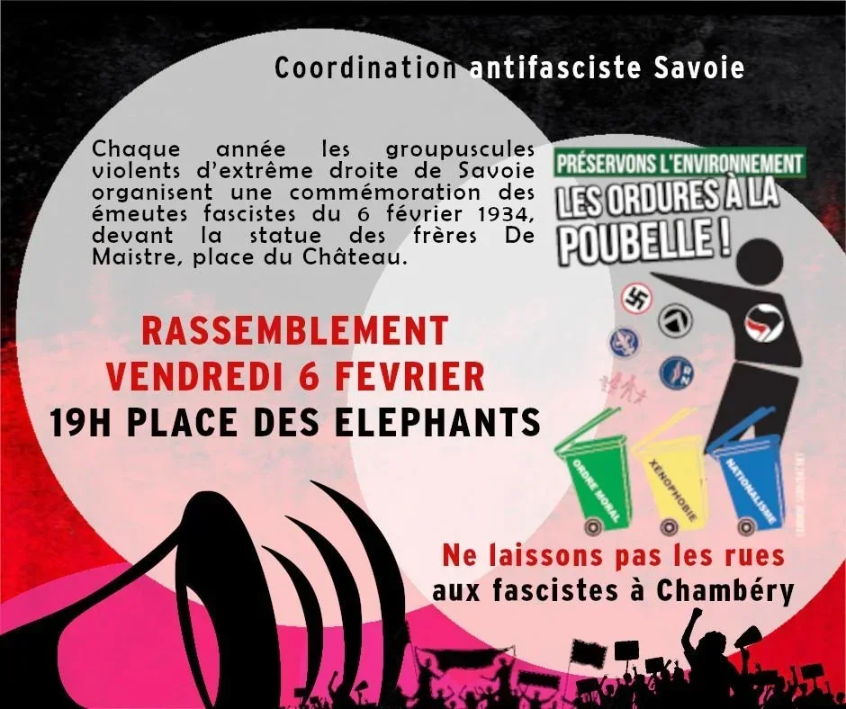 Chaque année les groupuscules violents d'extrême droite de Savoie organisent une commémoration des émeutes fasciste du 6 février 1934, devant la Statut des frères De Maistre, place du Chateau.
