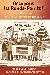 Venez nombreux marquer notre détermination à soutenir le Peuple Palestinien jusqu'à la satisfaction de ses droits imprescriptibles!Tous les samedis de février, nous occuperons les rond-points pour dénoncer cette mystification et informer nos concitoyens.
