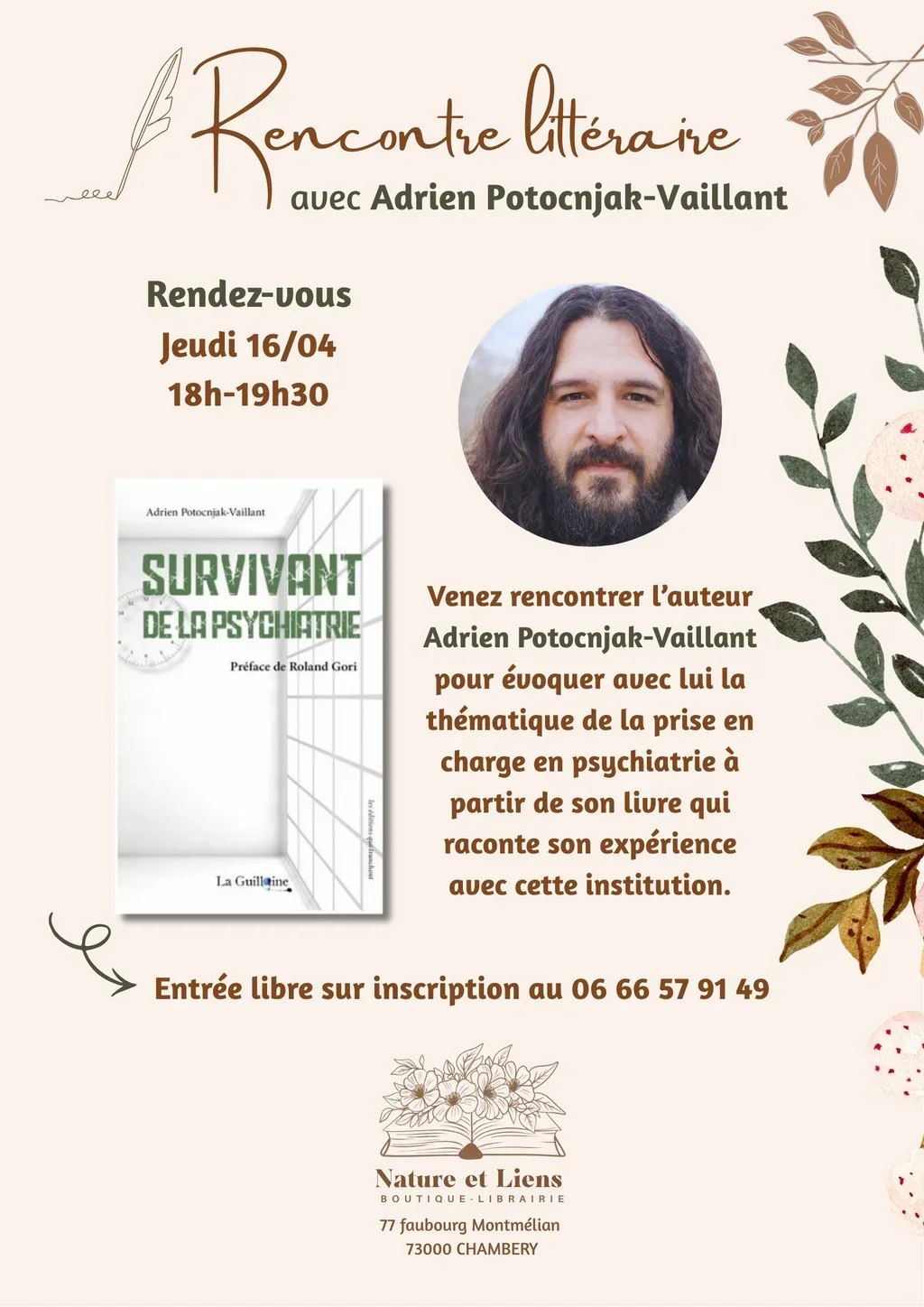 Survivant de la psychiatrie, d’Adrien Potocnjak-Vaillant, sera au cœur de notre prochaine rencontre littéraire, suivie d’une séance de dédicaces.