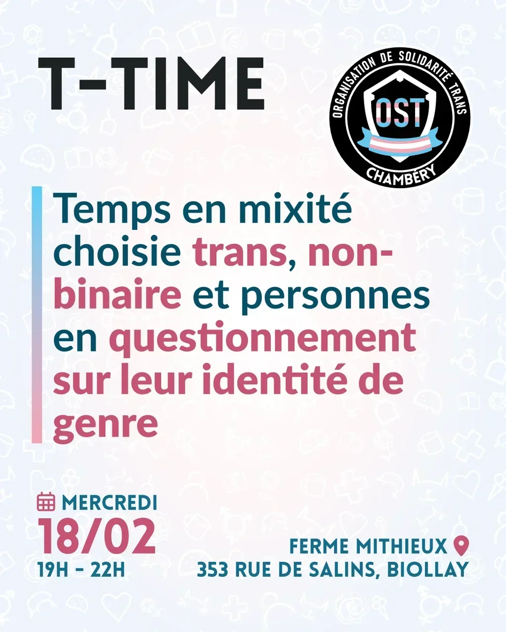 Le T-Time est un espace de rencontre animé par des personnes concernées. Toute personne concernée (qui le vit intimement, pas les proches) est la bienvenue !