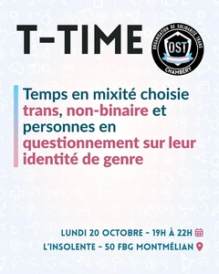 Le T-Time est un espace de rencontre animé par des personnes concernées. Toute personne concernée (qui le vit intimement, pas les proches) est la bienvenue !