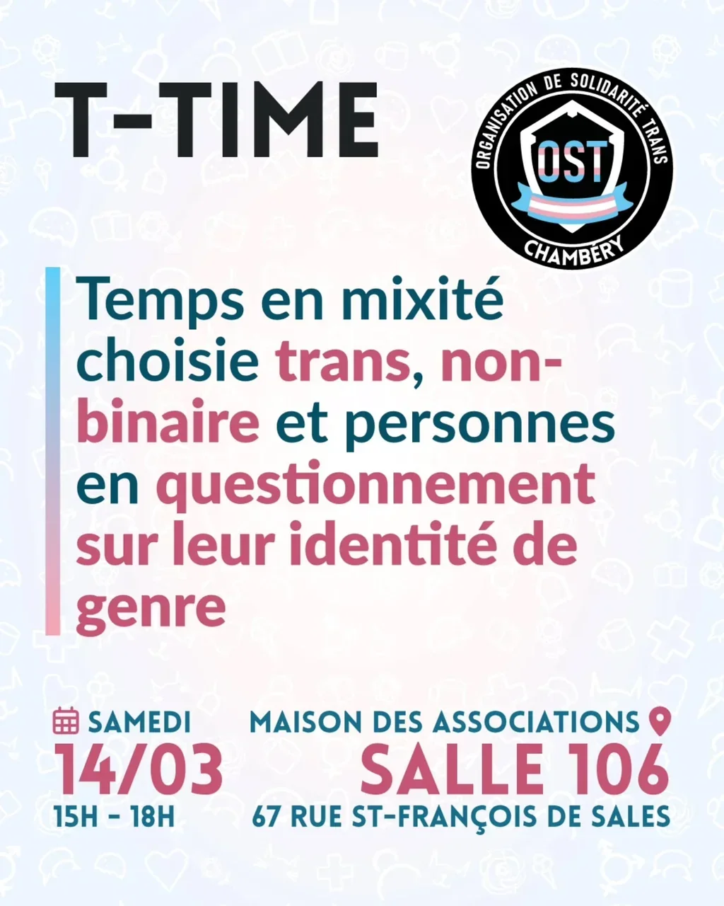 Le T-Time est un espace de rencontre animé par des personnes concernées. Toute personne concernée (qui le vit intimement, pas les proches) est la bienvenue !