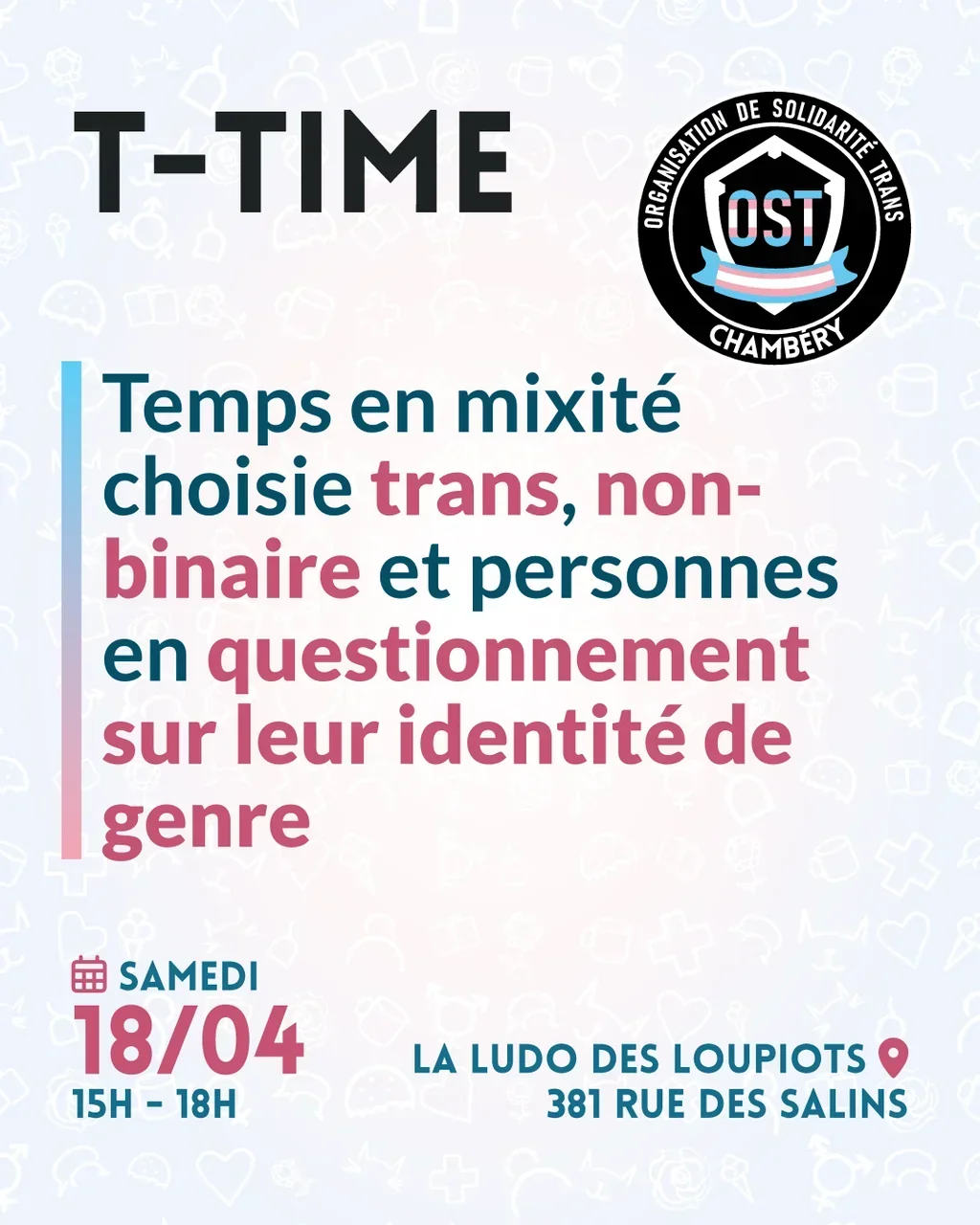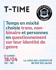 Le T-Time est un espace de rencontre animé par des personnes concernées. Toute personne concernée (qui le vit intimement, pas les proches) est la bienvenue !