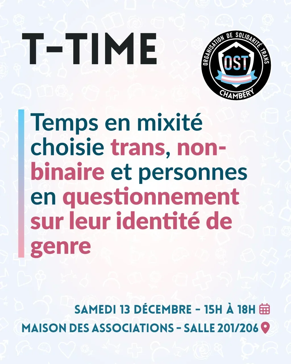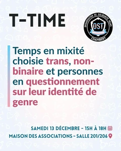 Le T-Time est un espace de rencontre animé par des personnes concernées. Toute personne concernée (qui le vit intimement, pas les proches) est la bienvenue !