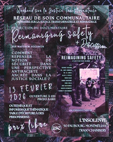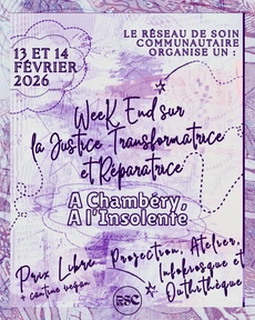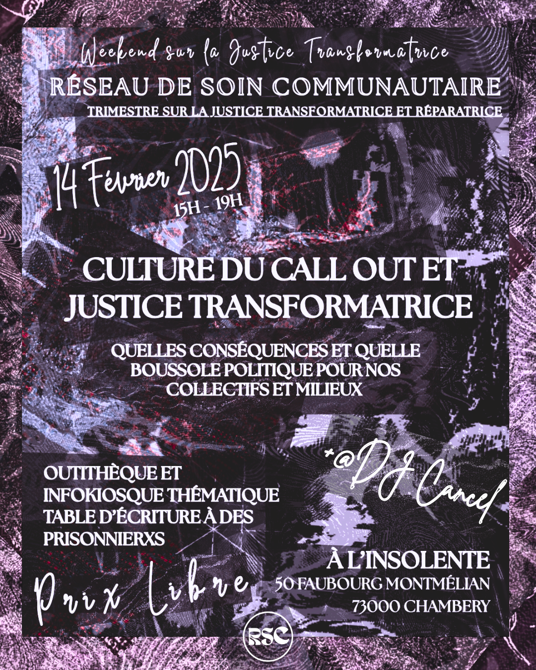 Le Réseau de Soin Communautaire vous donne Rdv à l'Insolente pour un weekend pour parler de justice transformatrice, d'alternatives au système pénale, de violence communautaire et de call out.