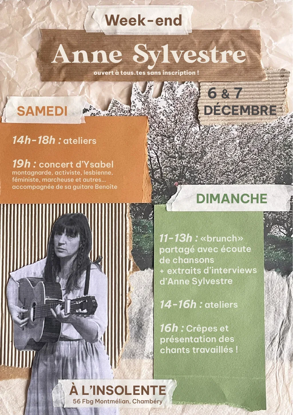 Le we du 6 et 7 décembre, des choristes membres des Echorâleur.euses organisent un week-end autour d'Anne Sylvestre. Ateliers de transmissions, écoute de chants, ateliers enfants, se dérouleront à l'Insolente tout au long du samedi après-midi et dimanche.