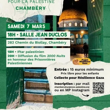 Urgence Palestine ChambĂ©ry s’est créé en avril 2024 et, comme partout en France, s’organise autour de la parole des Palestinien.nes. Le collectif appelle, comme de nombreuses organisations, Ă soutenir le peuple palestinien par le boycott et les manifestations locales les samedis Ă 14h (dĂ©part place de Genève) mais aussi en appelant des rassemblements et des opĂ©rations tractage au marchĂ© de ChambĂ©ry le Haut un dimanche par mois minimum. Â